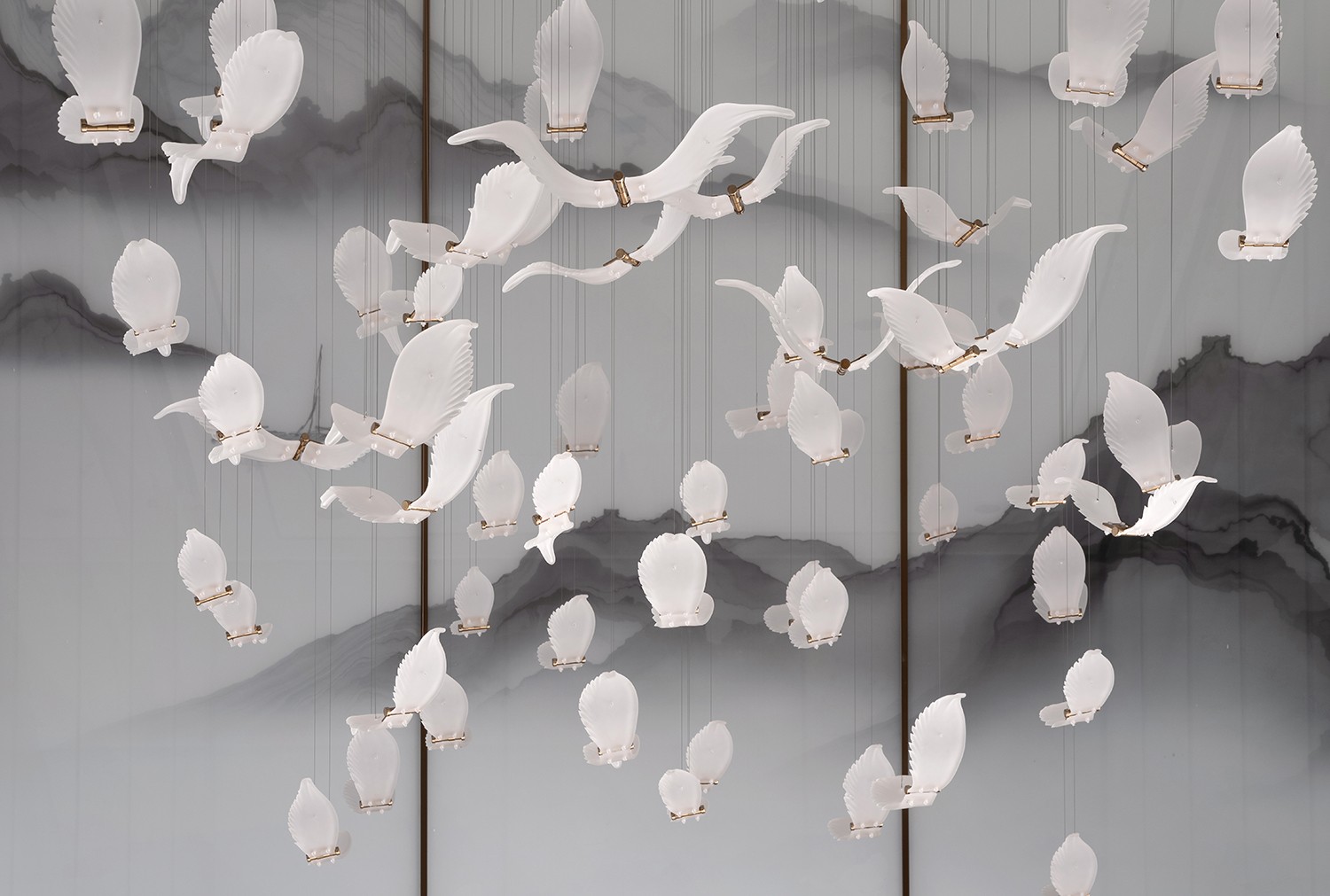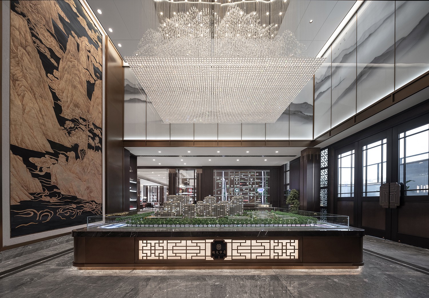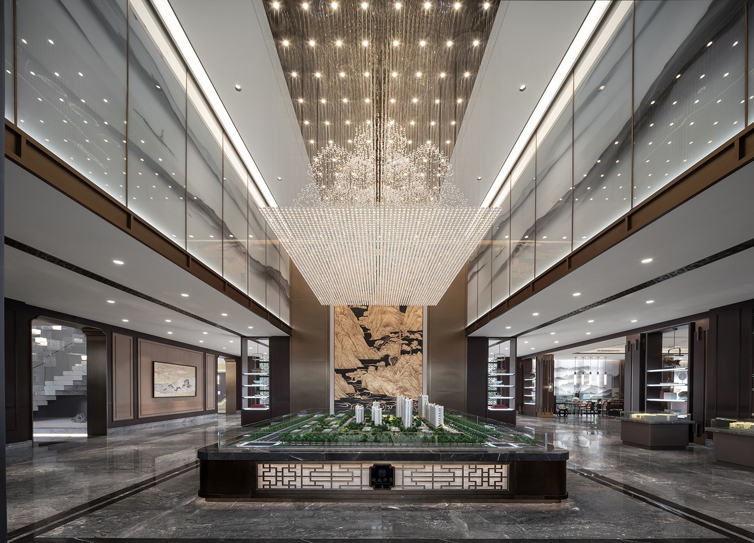 山水巨作配以高挑的空间,使整个楼盘熠熠生辉,大型水晶吊灯每一颗都散发出自身的光芒来照亮这片福地下的人们。黄古铜不锈钢的使用将整个空间的气质稳稳地拿捏着。