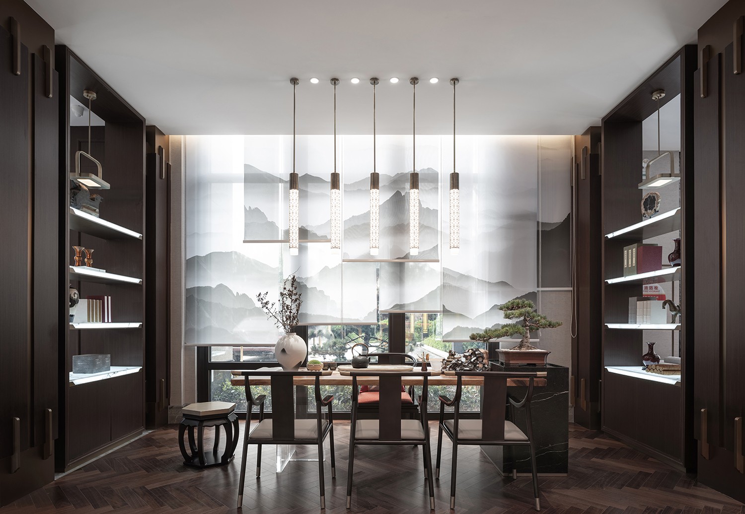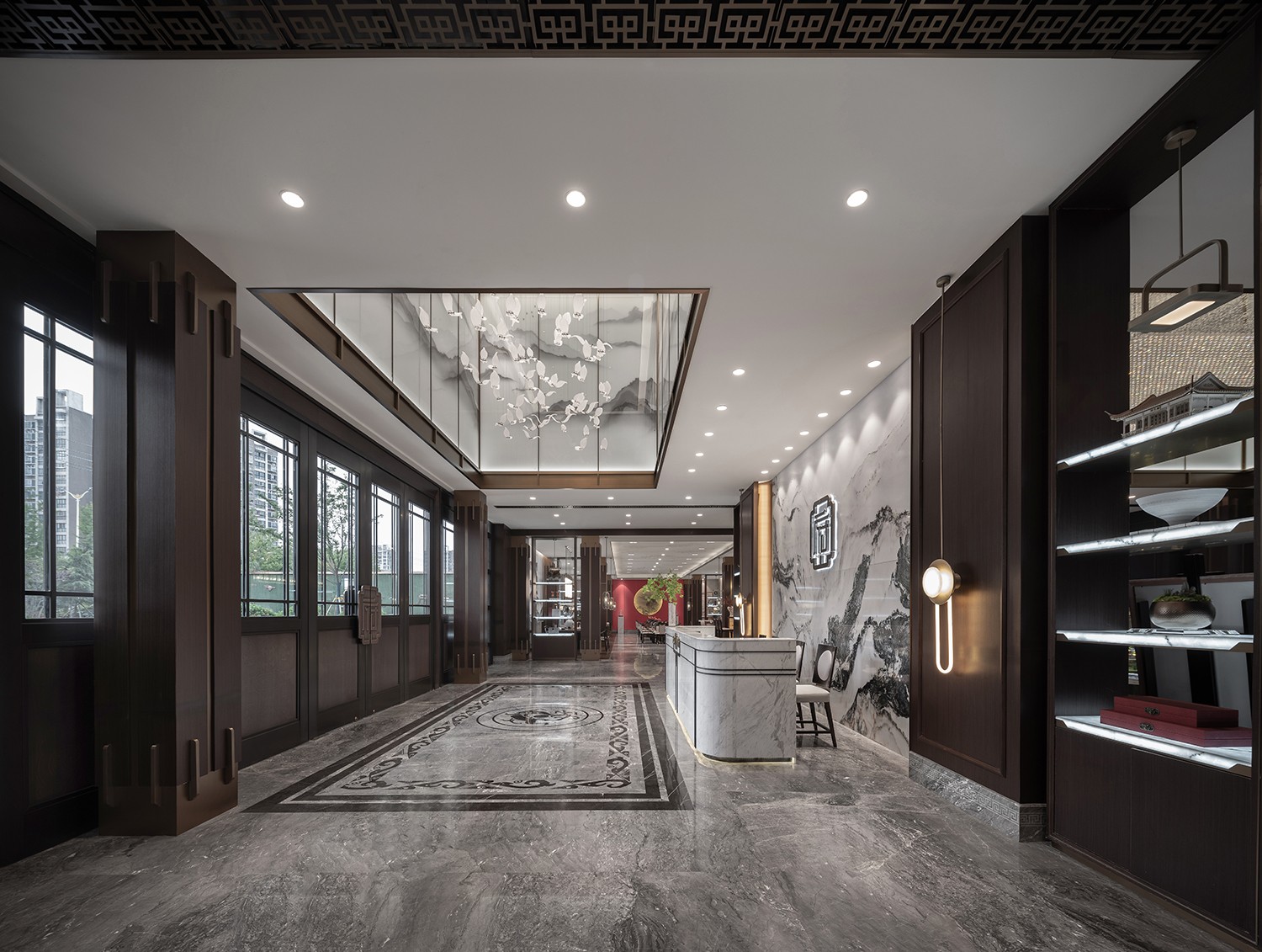 新中式风格外立面与室内风格相得益彰,漫步在院落中,山水错落、树木丛生,层层递进,内外开阔,相得益彰。步入门厅映入眼帘是一幅山水画石材,仰视顶上,灵动不经意间迸发出来,化为万千凤凰盘旋在空中,四周群山连绵起伏,回应着自然的呼吸与声响,让人不禁想起欧阳修“在乎山水之间也”的境地,为之折腰,为之向往。空间内部主要以极具反差的深浅色调为主,配以挑空的造型,通透感油然而生。即使是脚下地砖,我们也不会错过对它的塑造,龙纹展现出来的恢弘气势,当你踏进房门的这一刻起便萦绕在我们的身旁。