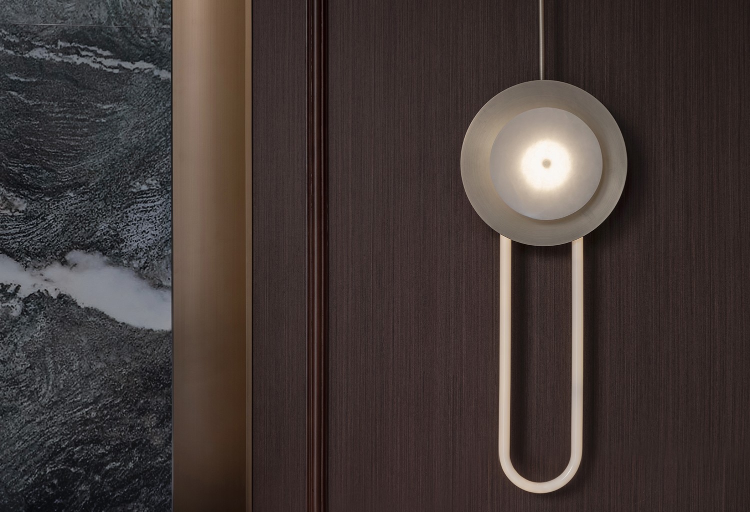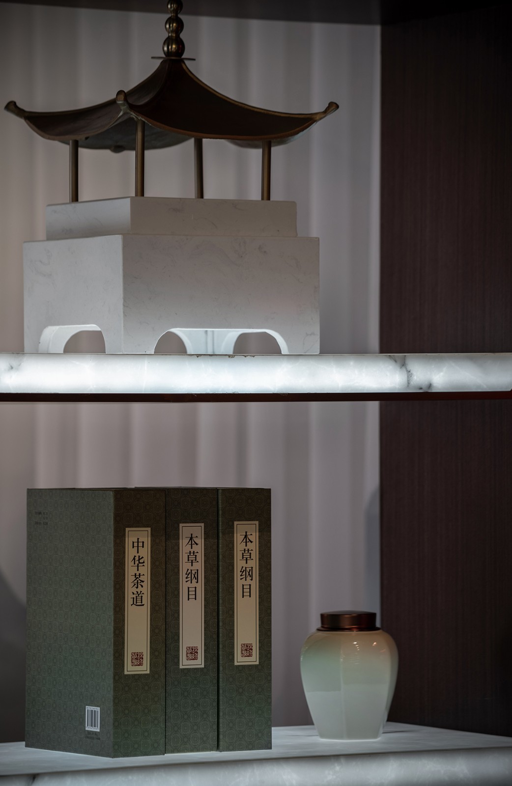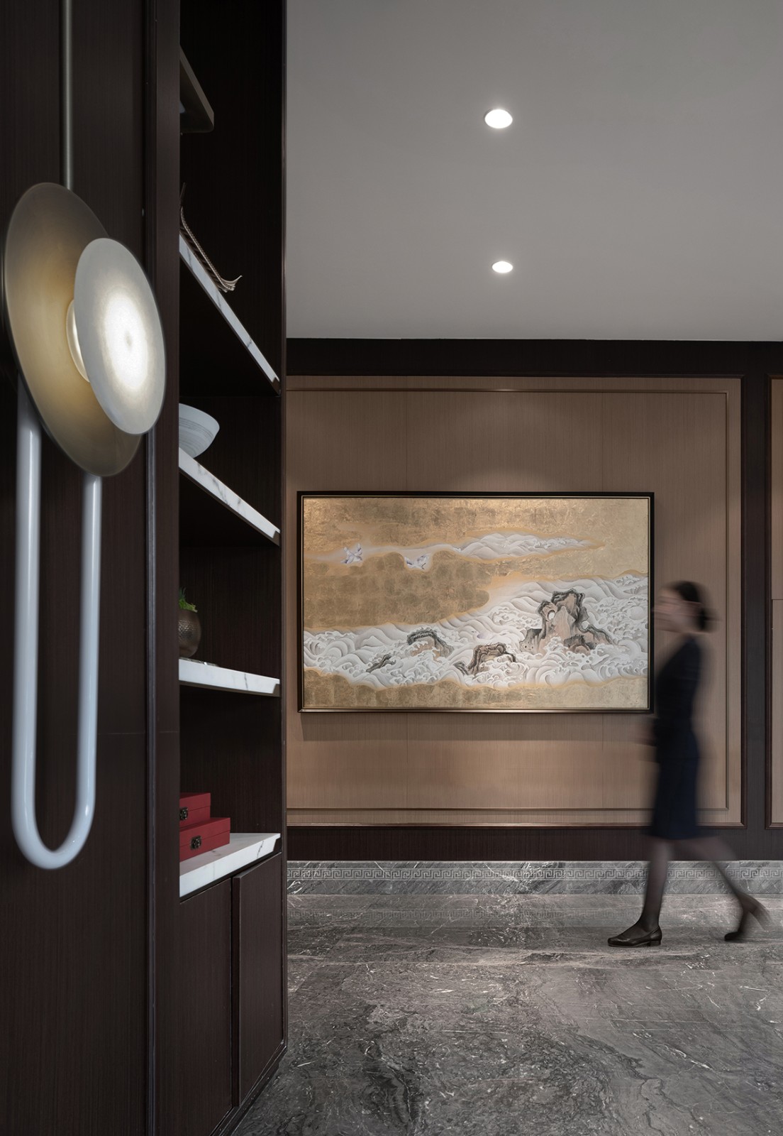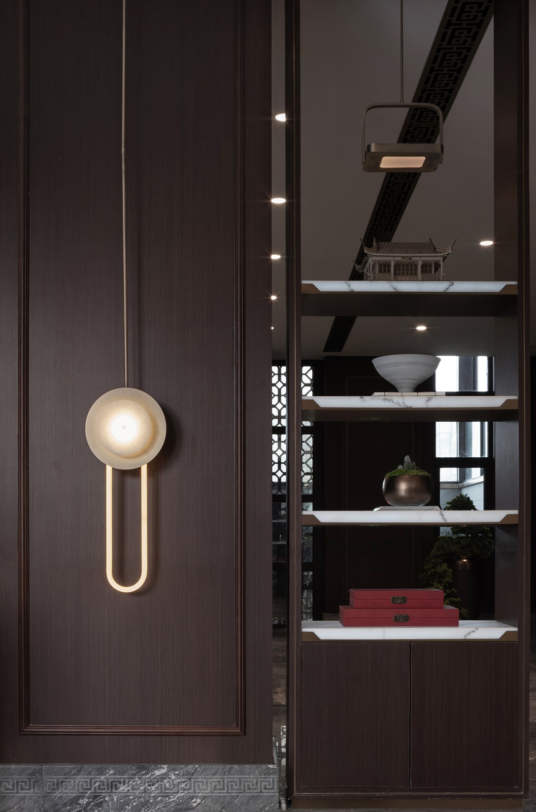 透光云石及造型光源在整个空间中发挥的不仅仅是装饰和照明的作用,更像是我们在寻找古今结合切入点的同时,充分发挥了其最大的特色。光弥漫在纯净的深色家具上给观者纯粹的视觉享受,与整体环境浑然一体,并自然融于空间之中。