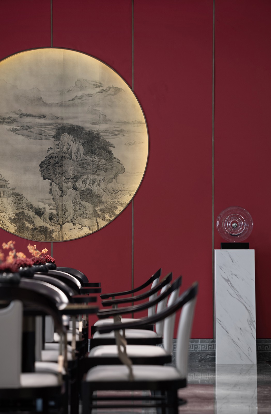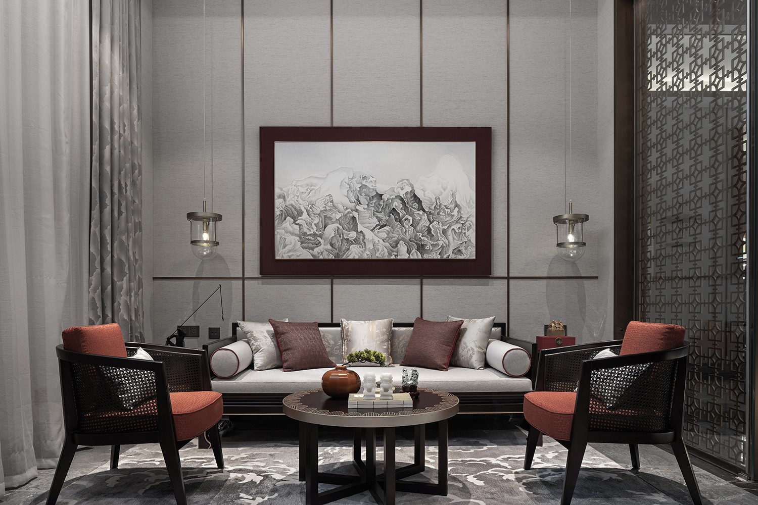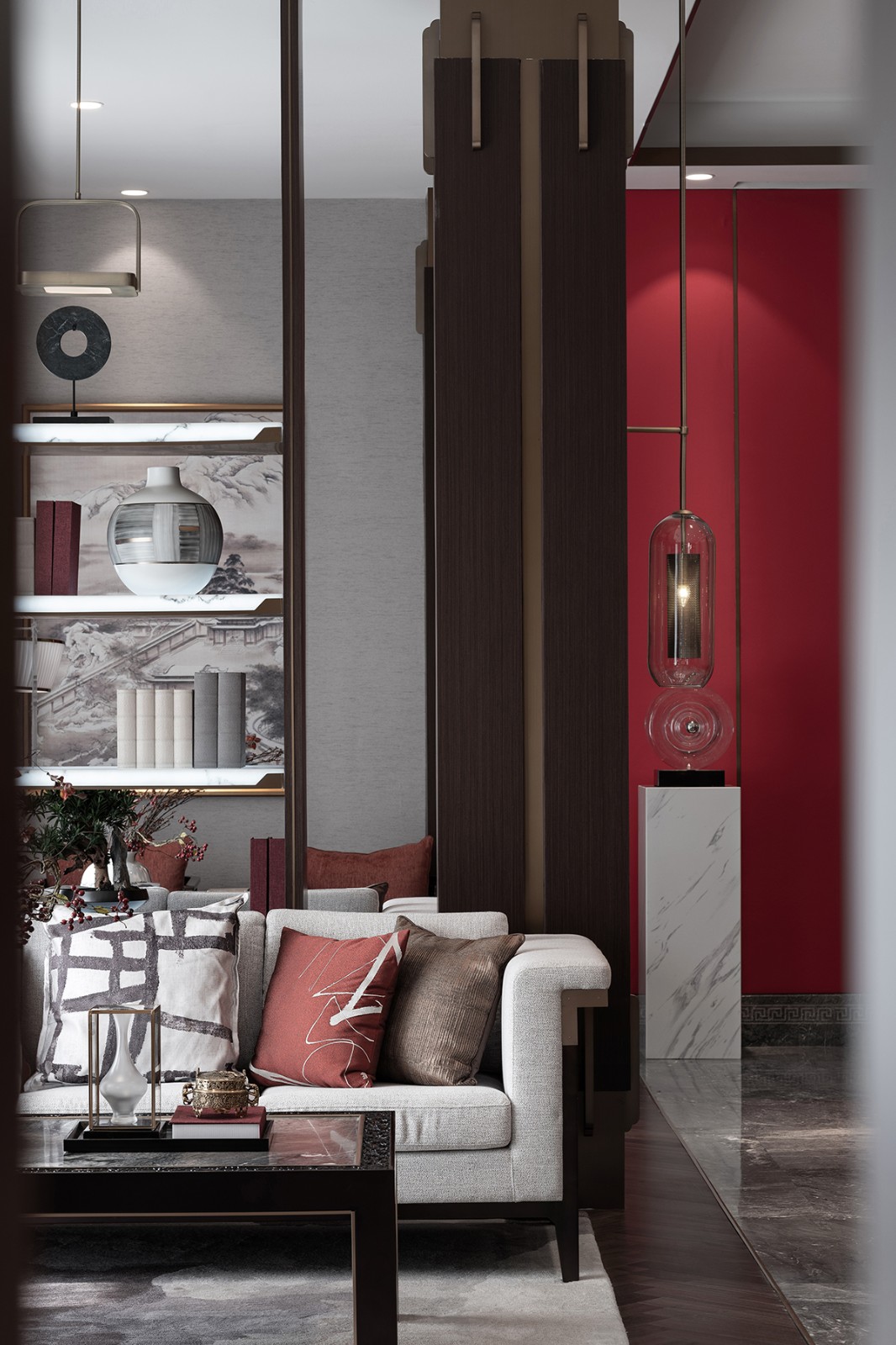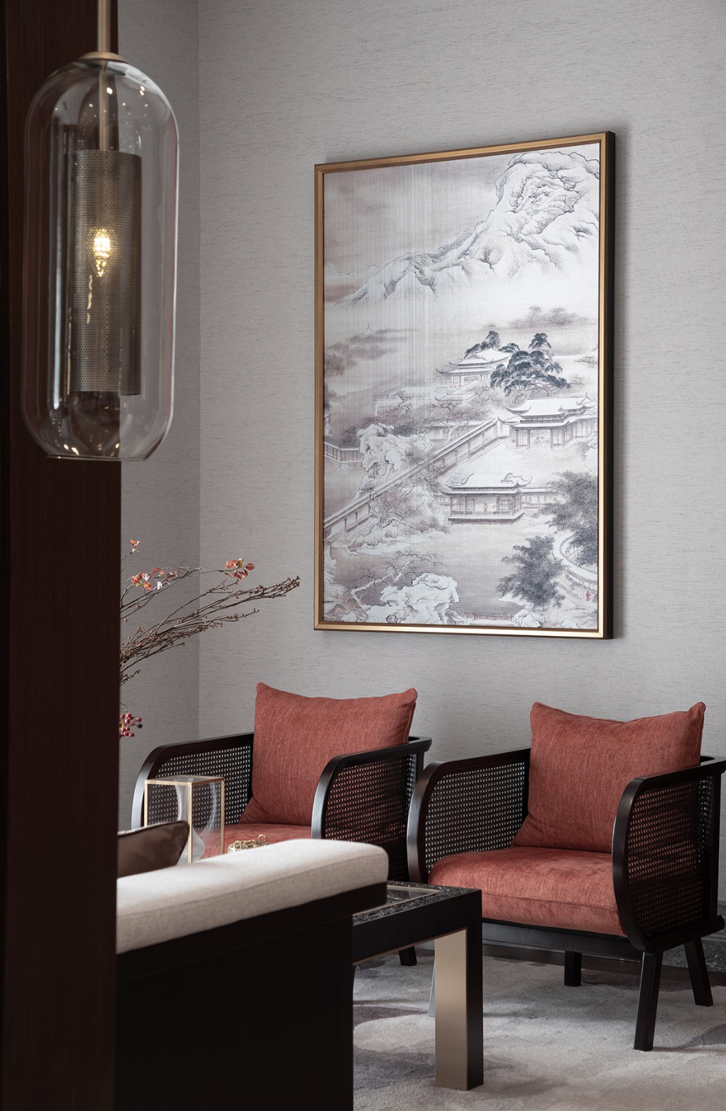 “枝间新绿一重重,小蕾深藏数点红”,那一抹尊贵耀眼的山楂红是整个空间唯一跳跃的色彩,它不似鲜红那么娇艳多姿,它像太阳,古朴而又温暖,照亮每一处地方。通过现代设计语汇使红色之于新中式的文化印象表现出引人细究的新颖性格,从而营造更能令人驻足放空的空间形态及沉潜和谐的整体效果。