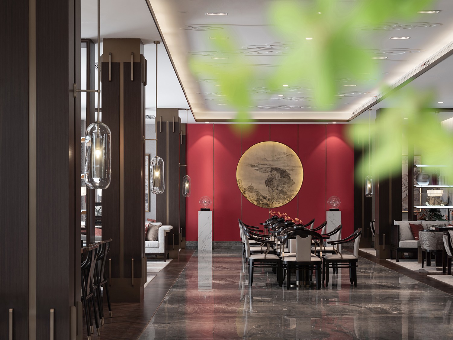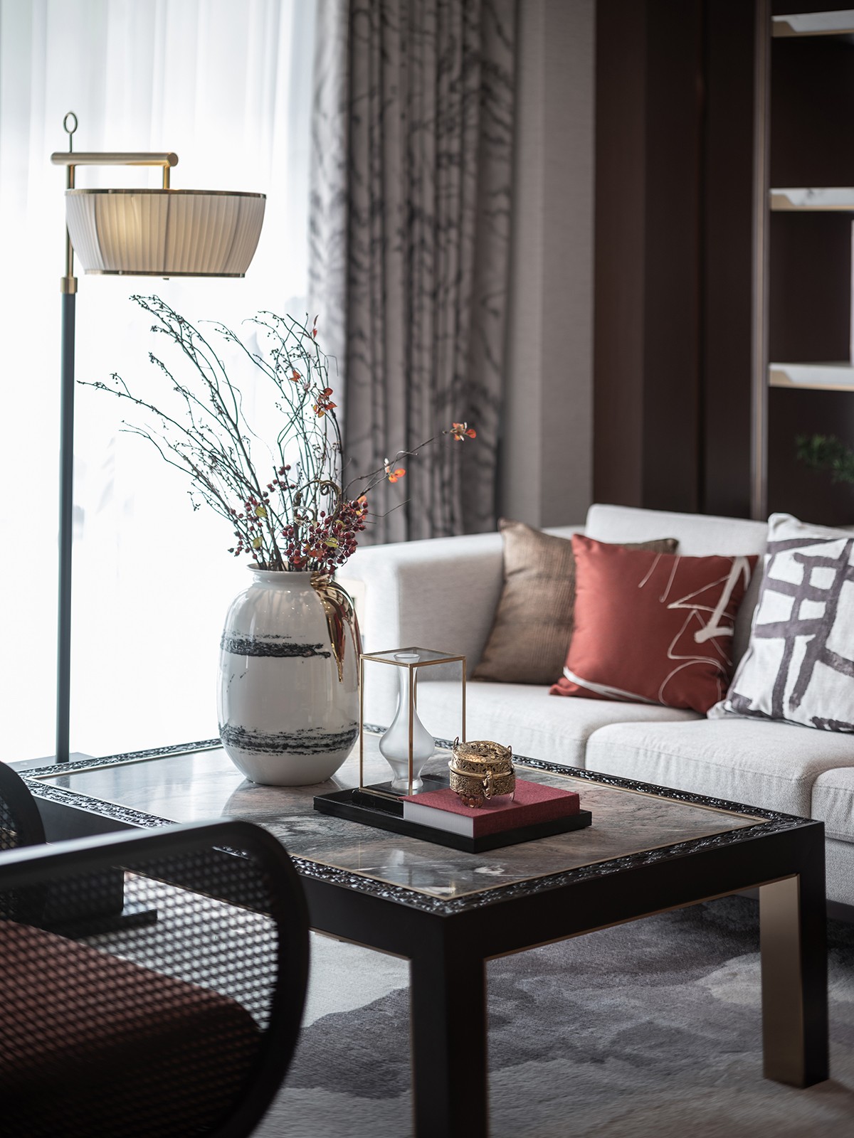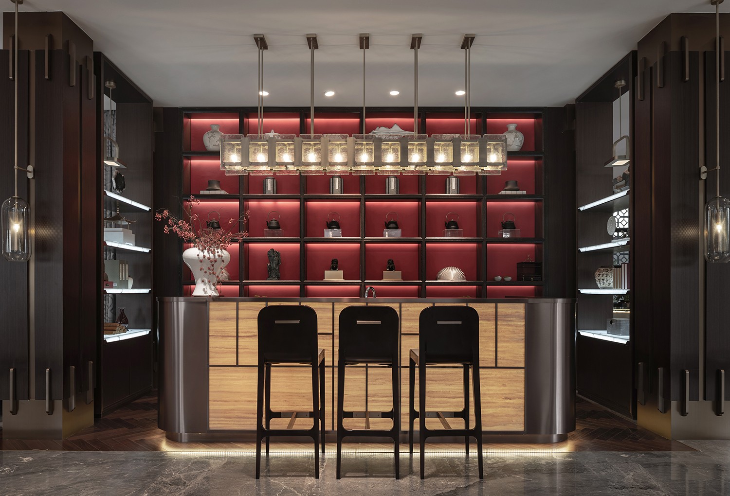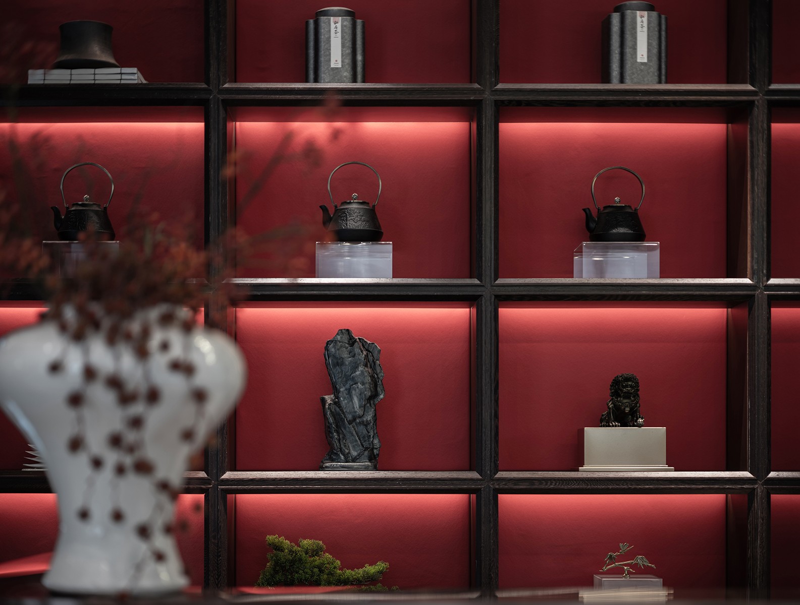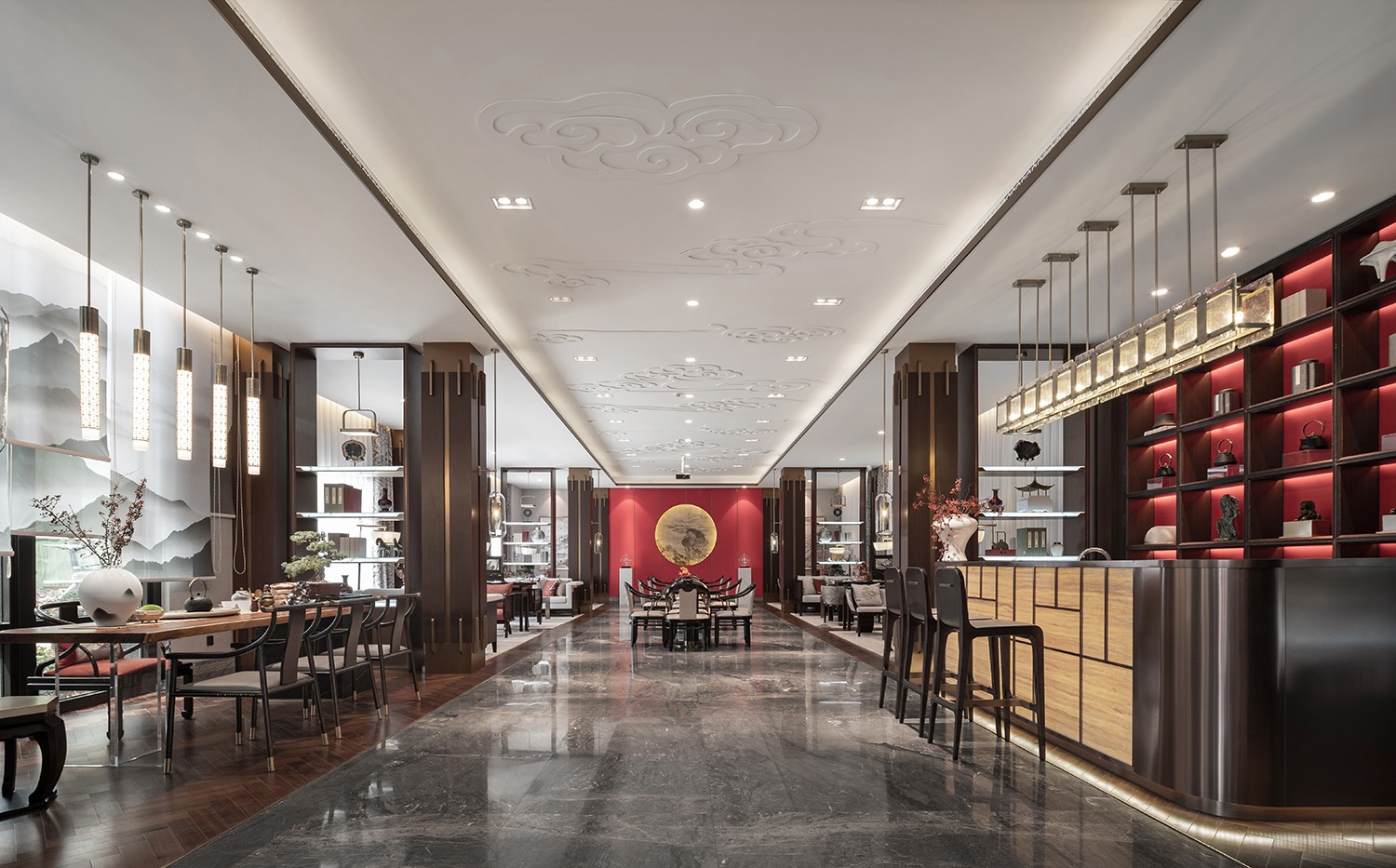 “枝间新绿一重重,小蕾深藏数点红”,那一抹尊贵耀眼的山楂红是整个空间唯一跳跃的色彩,它不似鲜红那么娇艳多姿,它像太阳,古朴而又温暖,照亮每一处地方。通过现代设计语汇使红色之于新中式的文化印象表现出引人细究的新颖性格,从而营造更能令人驻足放空的空间形态及沉潜和谐的整体效果。