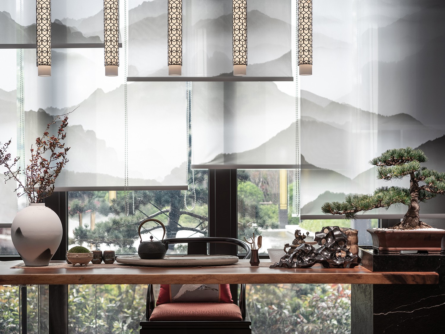 一帧帧山水佳作处处饱含着中式风格的大气与内敛,群山绵绵,轻烟淡峦,草木泽生,松木屋宅,清雅的色调打破起到与众不同的视觉效果,勾起人们的无限遐思。